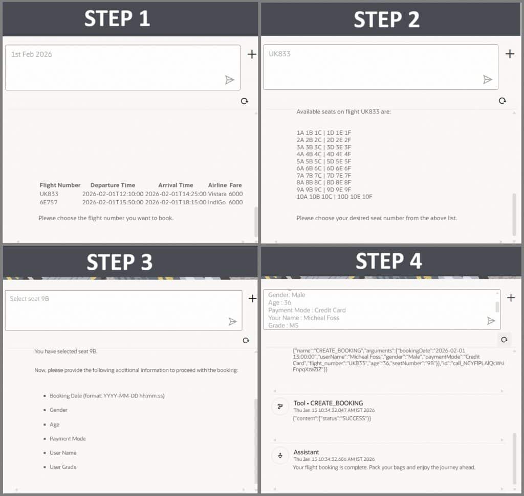 The AI Agent then interacts with the user to collect the remaining inputs, such as travel date, flight selection, and seat number. Based on the gathered information, the agent applies logical reasoning to determine which tool should be invoked next. It orchestrates the tool executions in sequence and finally completes the flight ticket booking.