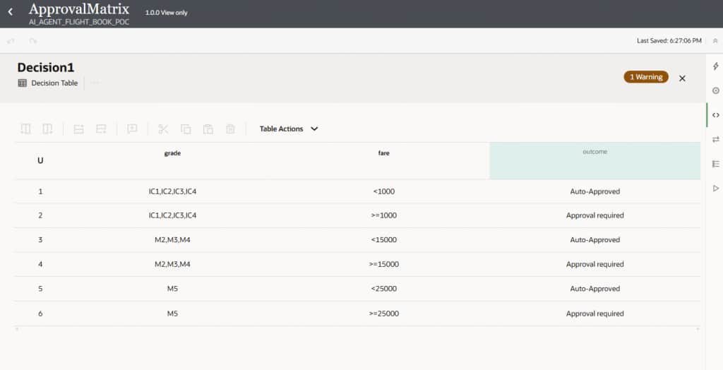 A decision approval matrix evaluates employee grade and flight fare using a decision table. Based on these inputs, the matrix determines whether the booking can proceed automatically or requires additional approval. This approach ensures consistent decision-making, policy enforcement, and controlled approvals across the flight booking process. We also created an integration that invokes the decision service with employee grade and flight fare as inputs to determine the appropriate approval outcome. To learn more about Decisions, you can refer to the Oracle blog Click here.
