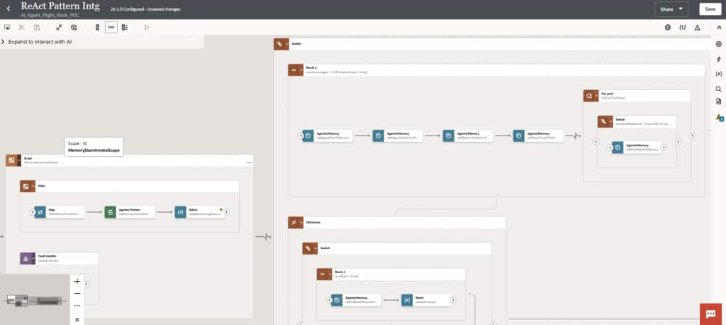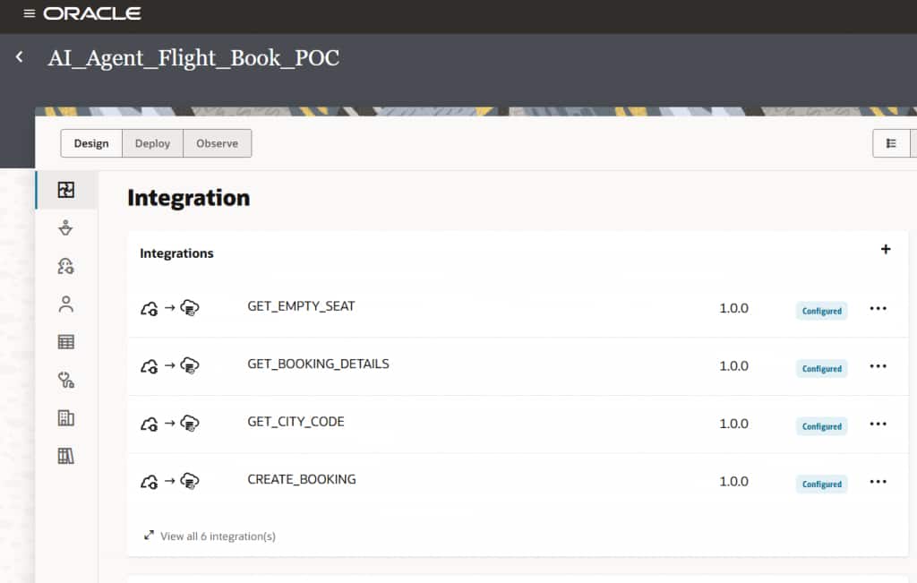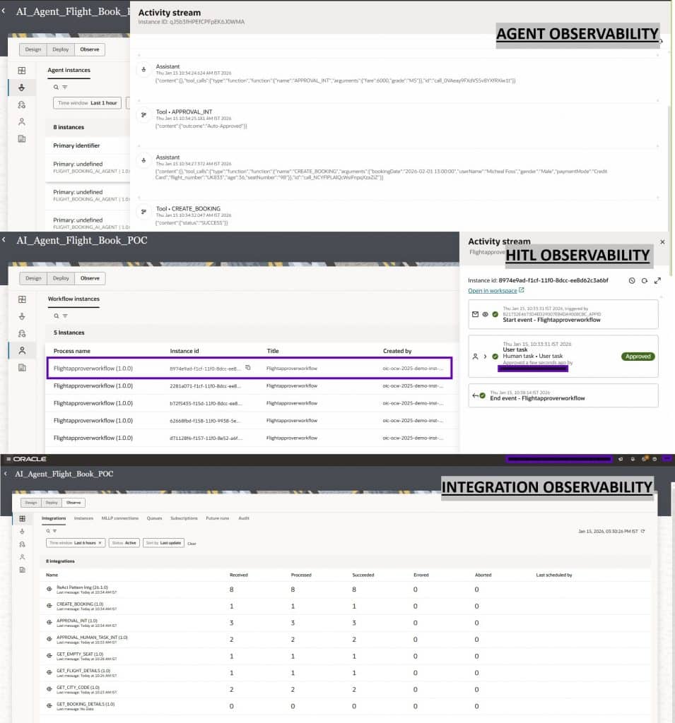 Human in the loop: Human in the Loop (HITL) is a capability in Oracle Integration that embeds structured human oversight into agentic AI workflows by introducing intelligent checkpoints where human judgment is required before critical actions are taken — such as approvals, exception handling, or policy-sensitive decisions. Oracle Integration’s Decision service can be seamlessly combined with HITL to apply business rules before escalating to a human, ensuring that only the right requests reach an approver. In a flight booking scenario, when a fare exceeds an employee’s grade-based budget threshold, the AI agent can automatically route the request to a designated approver — pausing the booking process until an approval or rejection is received, after which the agent resumes execution — ensuring full governance, traceability, and policy compliance throughout. For a deeper dive, refer to our detailed blog here.
