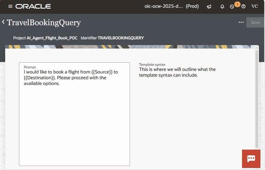 Prompt Templates provide a ready-to-use system prompt that includes placeholders for dynamic variables, enabling structured and reusable interactions with LLMs. During execution, these templates are automatically populated with values derived from the integration payload, ensuring that each request is context-aware and tailored to the specific business transaction. Once the placeholders are replaced with actual data, the completed prompt is sent to the LLM for processing. Additionally, an AI agent within OIC can be associated with one or more prompt templates, allowing it to handle different scenarios or use cases while maintaining consistency, governance, and reusability across AI-driven integrations.