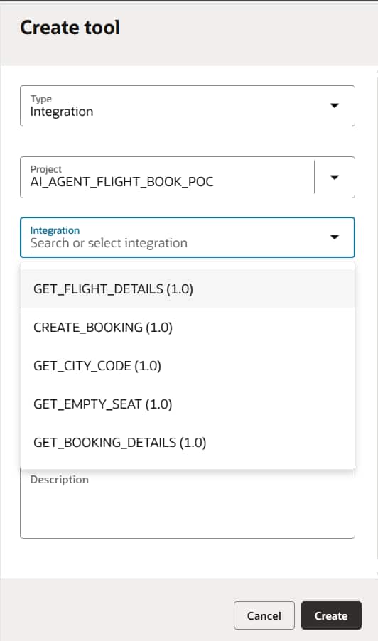 Tools are externally callable capabilities that an agent can invoke to perform actions or retrieve information using natural language. To create a tool, we need to select the integration that will serve as its implementation. As part of the current use case, we have implemented multiple integrations and exposed them as tools that the AI agent can invoke dynamically during orchestration. This automatically copies the integration’s description, which can be changed.