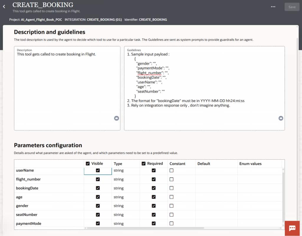 Once you click create, you will be able to see the metadata of the tool. This demonstrates how the tool can be used. As shown below there are multiple parameters required to invoke this tool, which will eventually invoke the respective integration. It is also recommended to include comprehensive guidelines that assist the LLM in understanding when and how to utilize this tool. For example, if the user provides a booking date in any format, the LLM converts the same to the required format while invoking the tool.