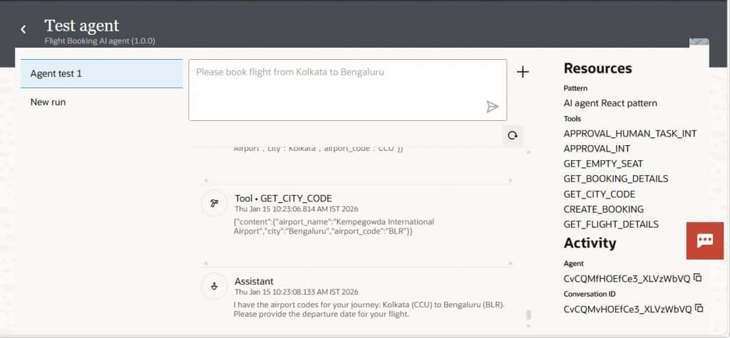 The AI Agent first understands user intent and validates it against defined guidelines. It then follows the selected agent pattern to orchestrate execution. Based on this pattern, the agent invokes the required tools and applies the guidelines configured for each tool to process the request and generate the final response. As shown below, based on the user input, the AI Agent first invokes the GET_CITY_CODE tool to retrieve the corresponding airport codes for both the source and destination cities.
