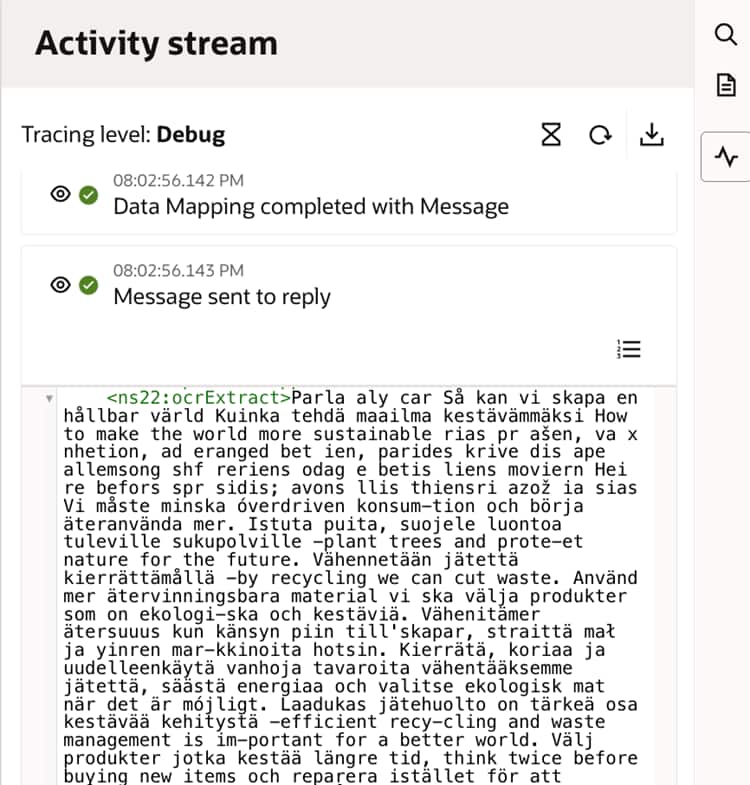 Processing such volumes using standard OIC looping constructs can significantly impact performance. To address this, the extracted content is passed as a file String to a JavaScript function, eliminating the need for extensive looping within OIC.