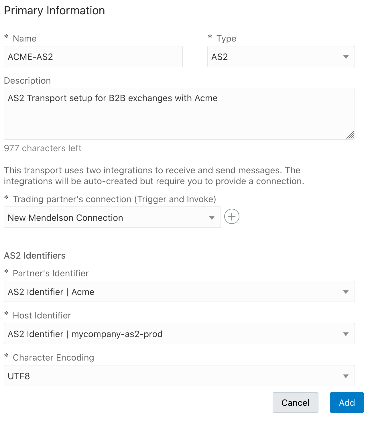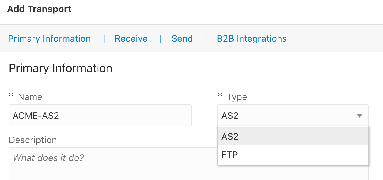 Now, you will be able to add and configure the Transport level properties for your B2B Integrations for AS2 and FTP type transports (once you have created the respective connections)
