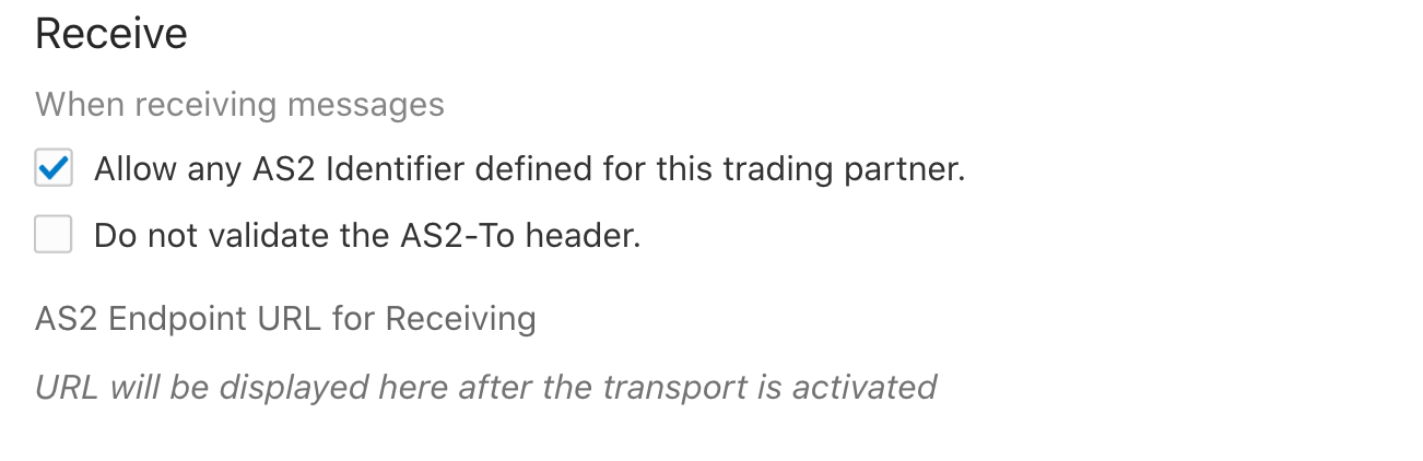 The Receive configuration enables setup of the Receive settings while processing incoming AS2 Transactions for this partner. Note that the AS2 endpoint is still not created currently and the AS2 URL you can use with your Trading Partner will be generated once you add the Transport.