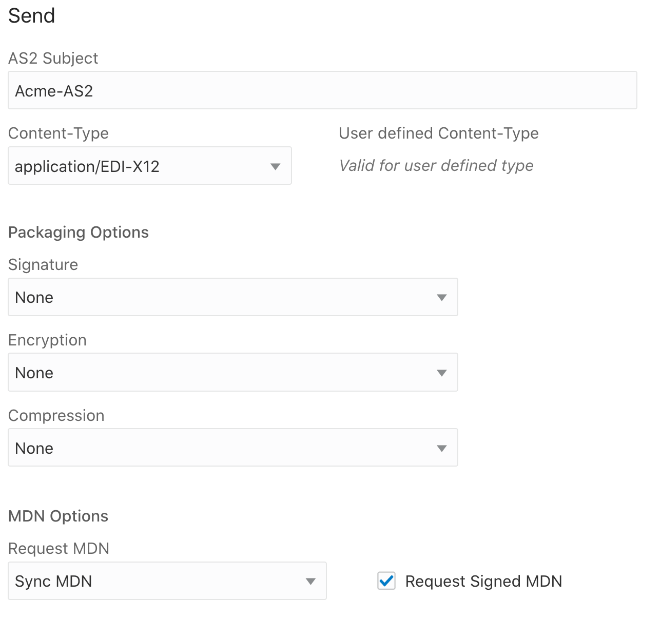 The Send configuration enables you to configure the details required for send or the outgoing transactions with your Trading Partner. This includes AS2 properties such as Subject and content type, Packaging options for signing and encryption as well as the MDN properties.