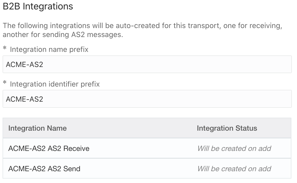 Finally, the B2B Integrations is where you can provide the Prefix you want to use for your B2B Integrations. With this release, we will automatically create your inbound and/or outbound B2B Integrations for AS2 and FTP.