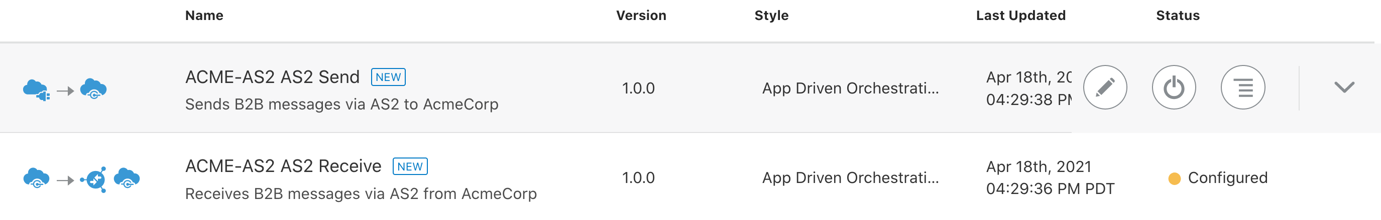 Here are the base B2B Integrations we created when the AS2 Transport was added for ACME. Integrations will be created by Trading Partner and Transport type which means that you can customize the Integration flow if you need to from the base template we provide.