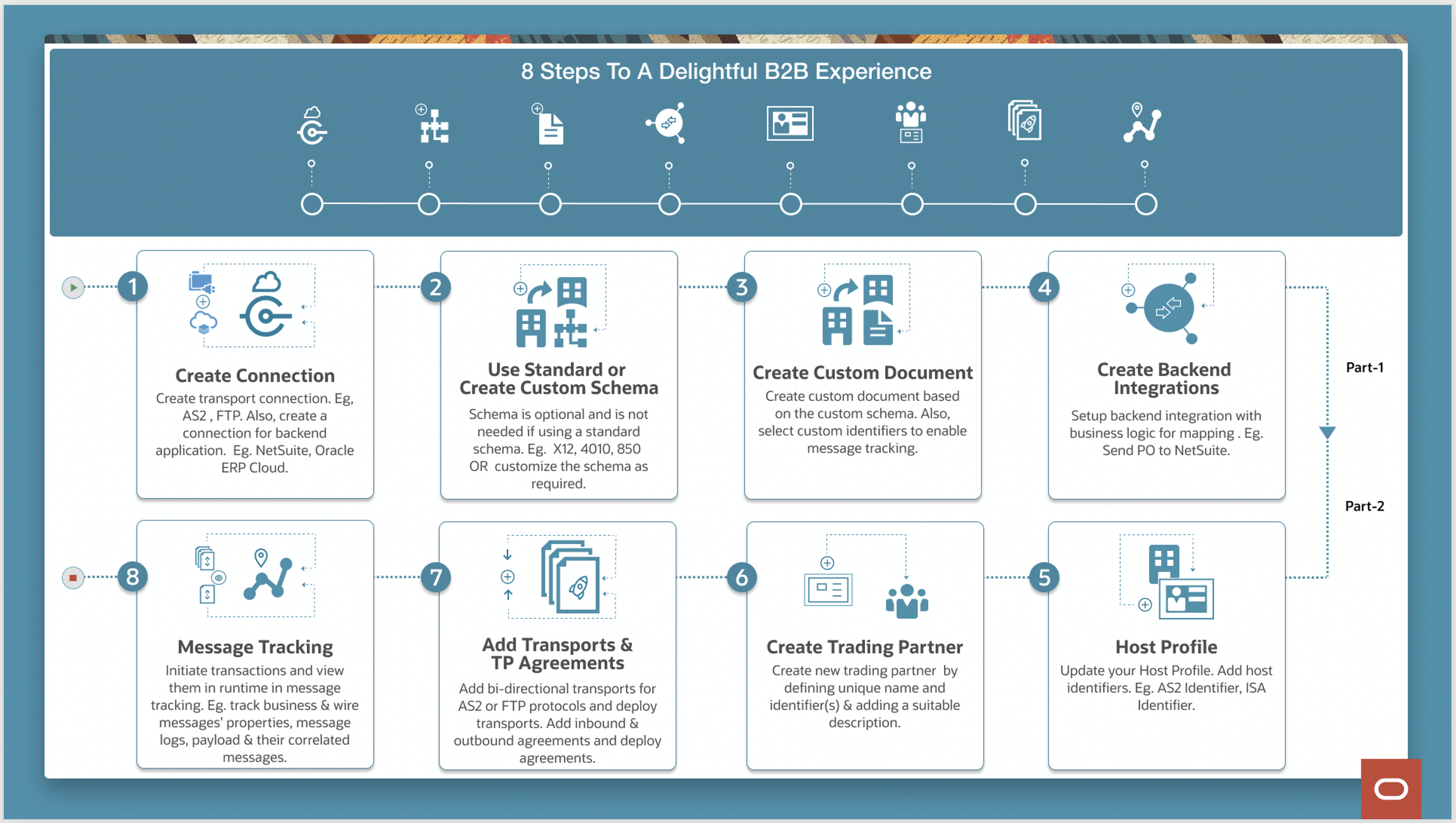 In Summary, we have simplified the steps required by a B2B User to onboard a Trading Partner. Once your Integration developer has created the backend Application Integrations then with the Transport and agreement deployments your Trading Partner onboarding can be completely done within the Trading Partner Management UIs without requiring the users to create or manage Integrations, unless otherwise required, enabling full support for B2B users for Design time activities.