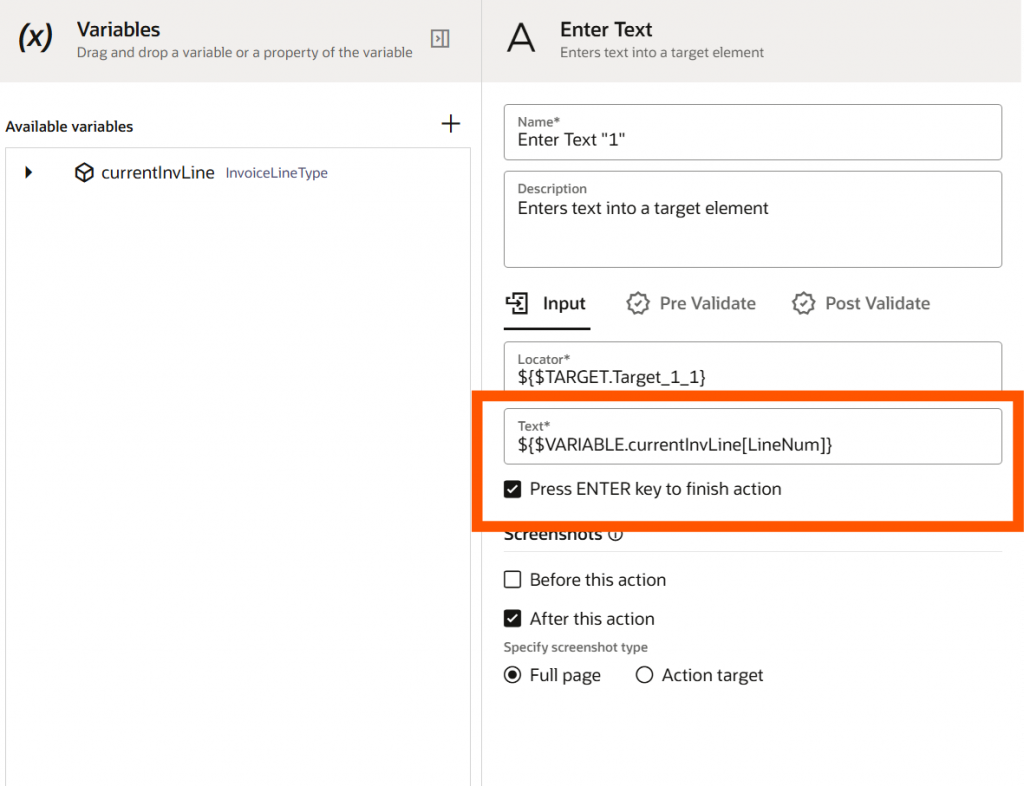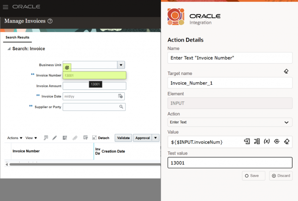 RPA allows you to “Record after the selected action” Record or by adding required Actions or Flow Control manually. For that, you need to make sure Browser extension is installed as a prerequisite. Once you reach the search invoice page, you can use the Enter Text option, where you provide the invoice number as an input parameter. Make sure one valid test data is available to you, which you can mention in “Test value.” This will assist you to update the respective field and help you to navigate to the next step.