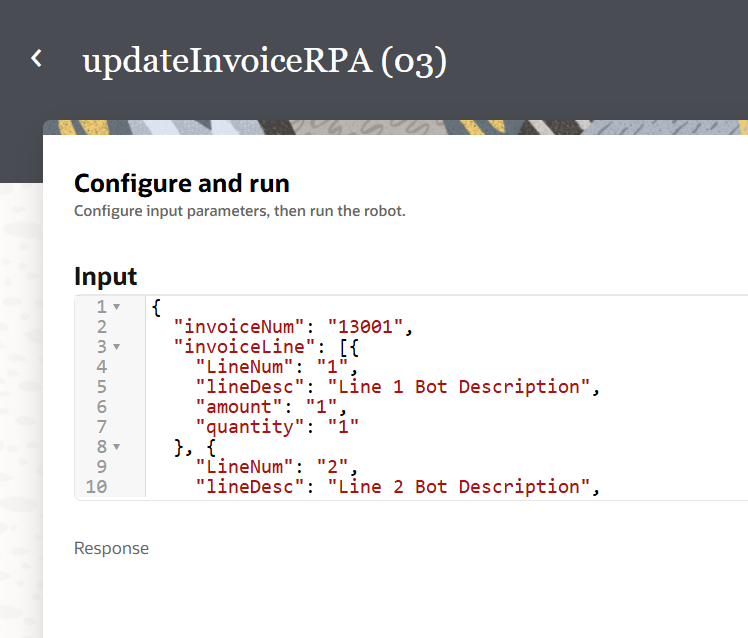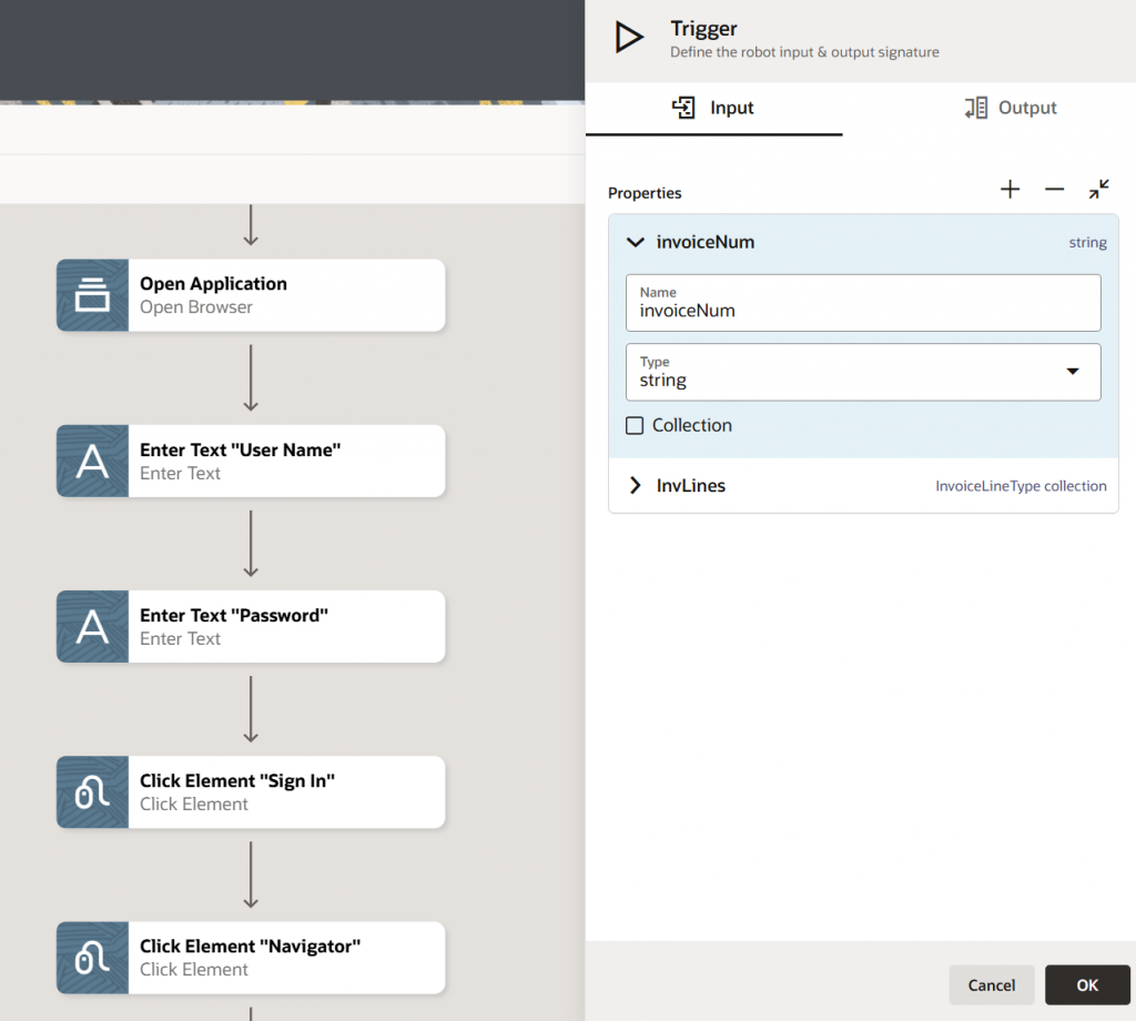 You can define input and output parameters in RPA. These parameters can be used as input arguments after the robot is activated. For example, if a bot processes invoices, instead of coding a fixed invoice number, you can pass the invoice number as an input parameter every time the bot runs.