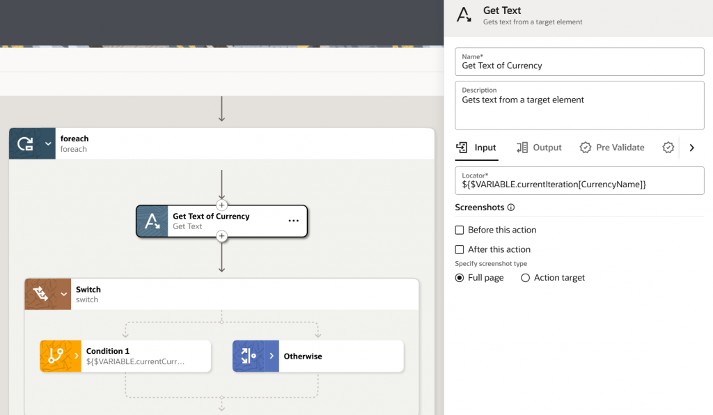 We created one variable currentCurrency to hold the currency of the current iteration. We will use the Get Text action to copy the currencyName from the current iteration of the webtable output variable to currentCurr local variable.