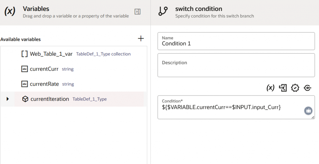 Now we have leveraged another flow control feature, Switch. A switch condition has the capability to evaluate one or more conditions and then take the appropriate action. The condition might include an expression to determine whether the value held by currentCurrency is equal to input_Curr coming as an input parameter.