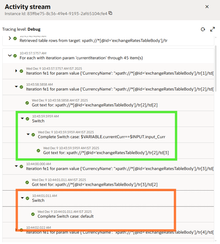 You can design an integration within the same project that calls multiple robots in accordance with the requirements. OIC provides Native Action “Robot flow” which can be used to invoke robot with required input parameters. In our use case, we have designed the integration in such a way that it will invoke the getCurrency Robot to retrieve the exchange rate for a certain currency, compute the amount that needs to be updated in the invoice, and then call the updateInvoice Robot. You can review the activity stream for the Robot under the Observe tab in the project. Check whether each step ran correctly: Green checkmarks indicate that the action was completed successfully. A red X indicates that the robot wasn’t able to complete the action. In the below activity stream of the GetCurrency robot, you may observe the robot is comparing currency names in each iteration. Once the condition is fulfilled, it’s using the Get Text action to retrieve the respective exchange rate & map to output parameter.