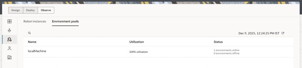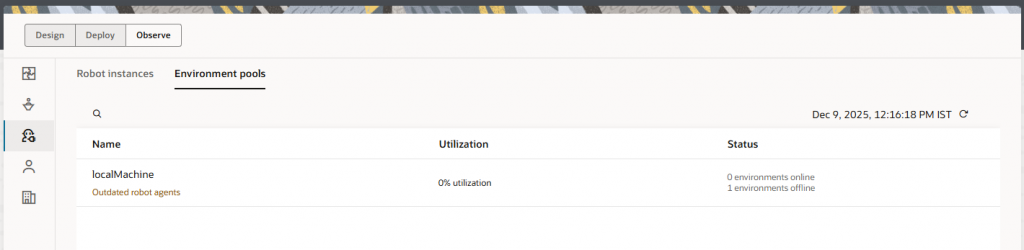 Under Observe you can monitor environments and environment pools within a project. You can identify shared environment pools, find environments that require updates to the robot agent, and check whether an environment pool has enough environments to handle its robot instance load. Hence, it’s recommended to download the latest agent, install it, and add it into the environment pool.