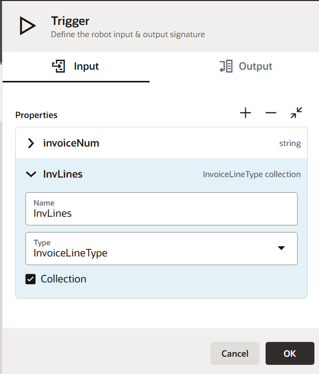Once the data type is created, it will be available as a Type while creating any variable. In order to utilize a complex type as an input parameter, you must choose that type. For example, if you need to update several invoice lines, you can construct an input parameter called invoiceLine with the type invoiceLineType. Make sure the Collection option is selected before passing an array of invoice lines as an input parameter.