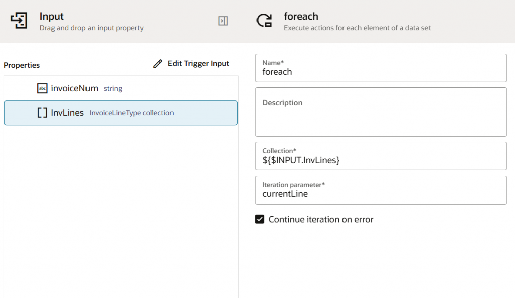 When a robot performs the same actions for multiple items, add the actions to a foreach loop. Consider an organization that needs to manually update several invoice lines. We generated an input parameter collection called invoiceLine, as seen in the previous step, and we will use a foreach loop collection & in the iteration parameter, enter the name to give to every record in the collection. As per business requirements, you can check Continue iteration on error.