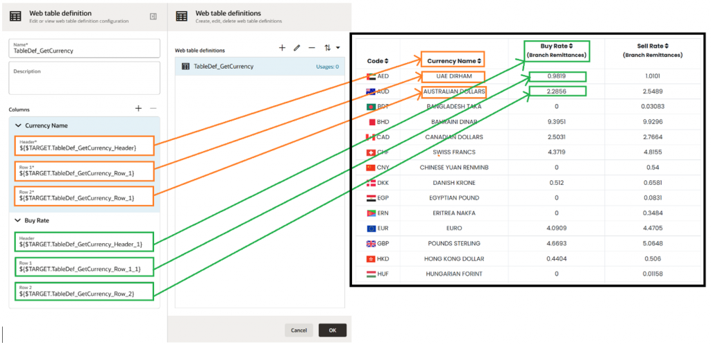 We will set up another ROBOT to retrieve the recent currency exchange rate from a bank’s website, which does not provide an API for this purpose. The bank website maintains the currency name along with buy/sell rate in tabular format. In Oracle Robotic Process Automation, a Web Table Definition is a way to identify and interact with those HTML table elements on a web page during automation. OIC RPA offers a structured way to define the web tables using “Target a Page Element” in which you must choose all necessary columns and two sample rows for each column, as demonstrated below.