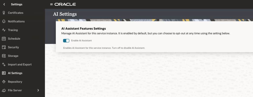 To take advantage of this feature in your Oracle integration instance, validate if the Enable AI Assistant option is enabled in the AI Settings page. This is enabled by default.
