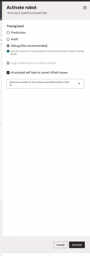 When the Enable AI Assistant option is enabled, then during Robot activation you can choose to enable the AI assisted self heal to correct XPath issues feature as indicated below.