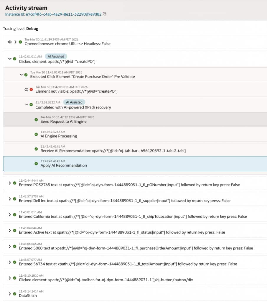 Instead, at the point of failure, OCI Generative AI is invoked with details of the error and its execution context. Based on this input, it generates recommendations to resolve the issue, such as identifying alternative UI elements or adjusting selectors.