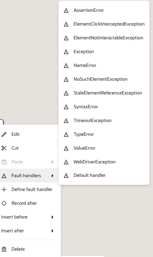 All possible exceptions for the action are listed, allowing you to either select from predefined fault types or define custom fault handling logic. For instance, you may choose to handle a StaleElementReferenceException by adding a log action to capture the exception message within the fault handler.