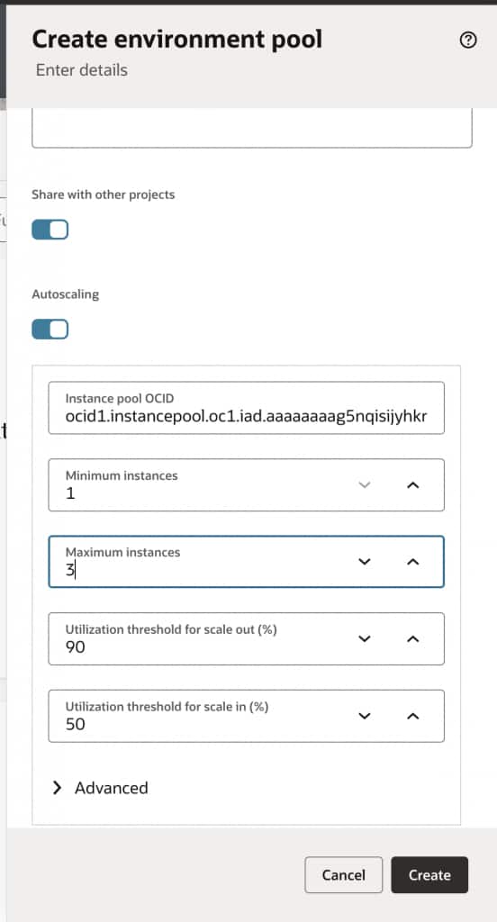 When configuring an environment pool, you can enable auto-scale by providing additional details such as the OCI Instance Pool OCID, minimum and maximum number of robot agents, and scaling policies that define when to scale in or out based on environment pool utilization.