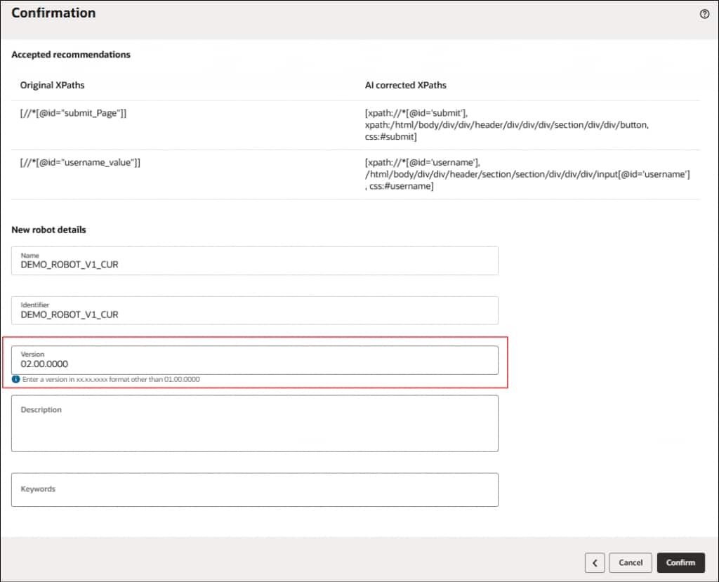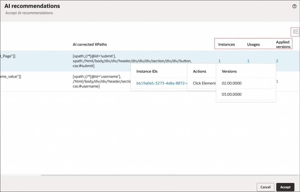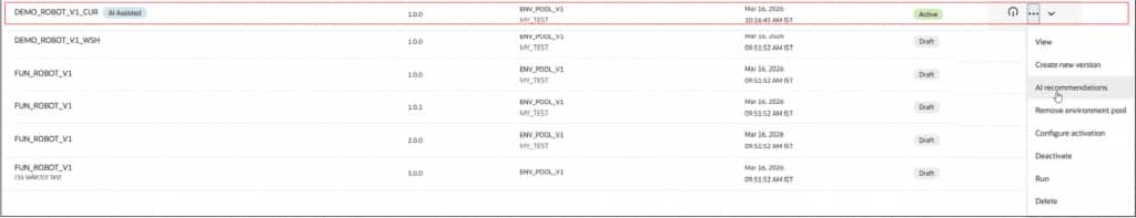Additionally, these runtime recommendations are made available during design time as AI recommendations for automation developers. Developers can review and accept these recommendations, which results in the creation of a new version of the robot incorporating the approved changes. This new version ensures that future executions benefit from the learned improvements.