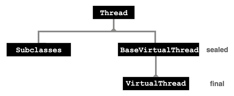 Note that the class VirtualThread is explicitly declared as final and cannot be subclassed. Therefore, any existing class that extends Thread directly will be a platform thread. This is part of the principle that the arrival of virtual threads must not change the semantics of any existing Java code.