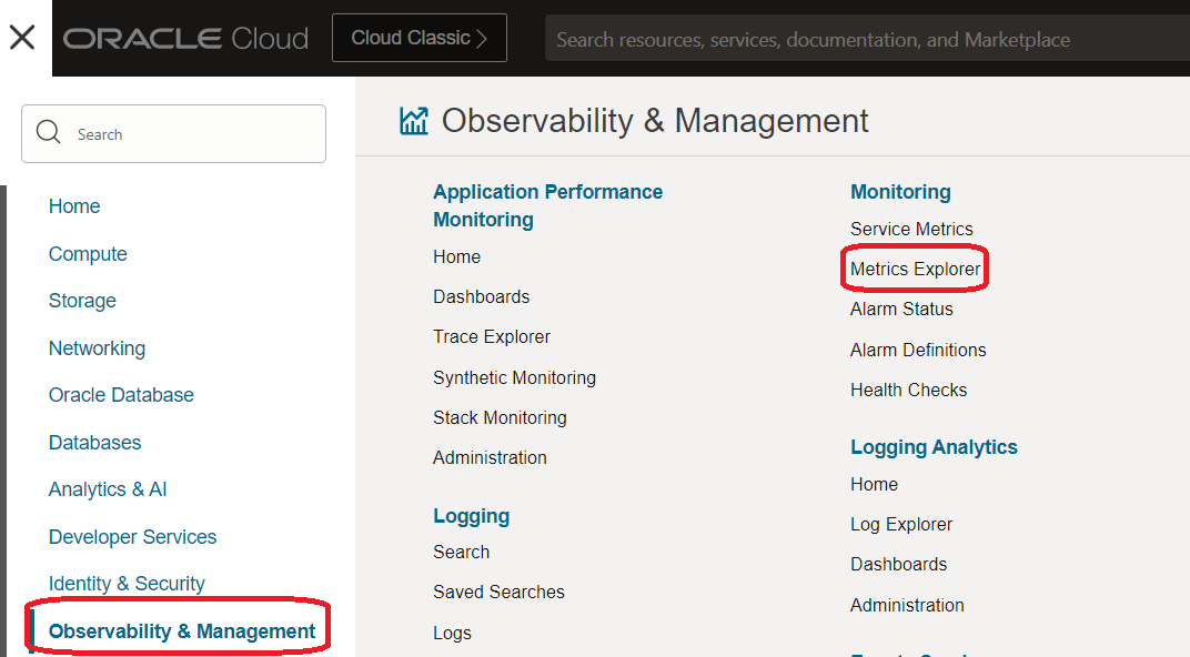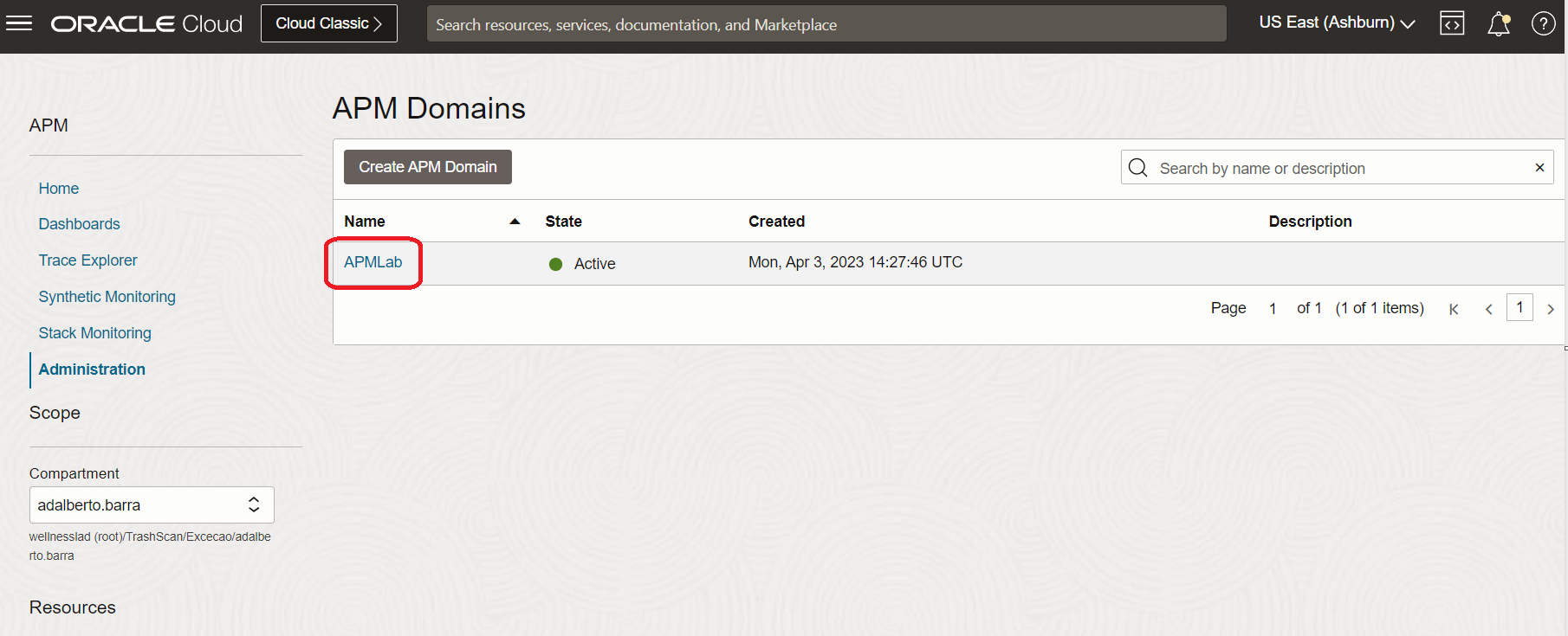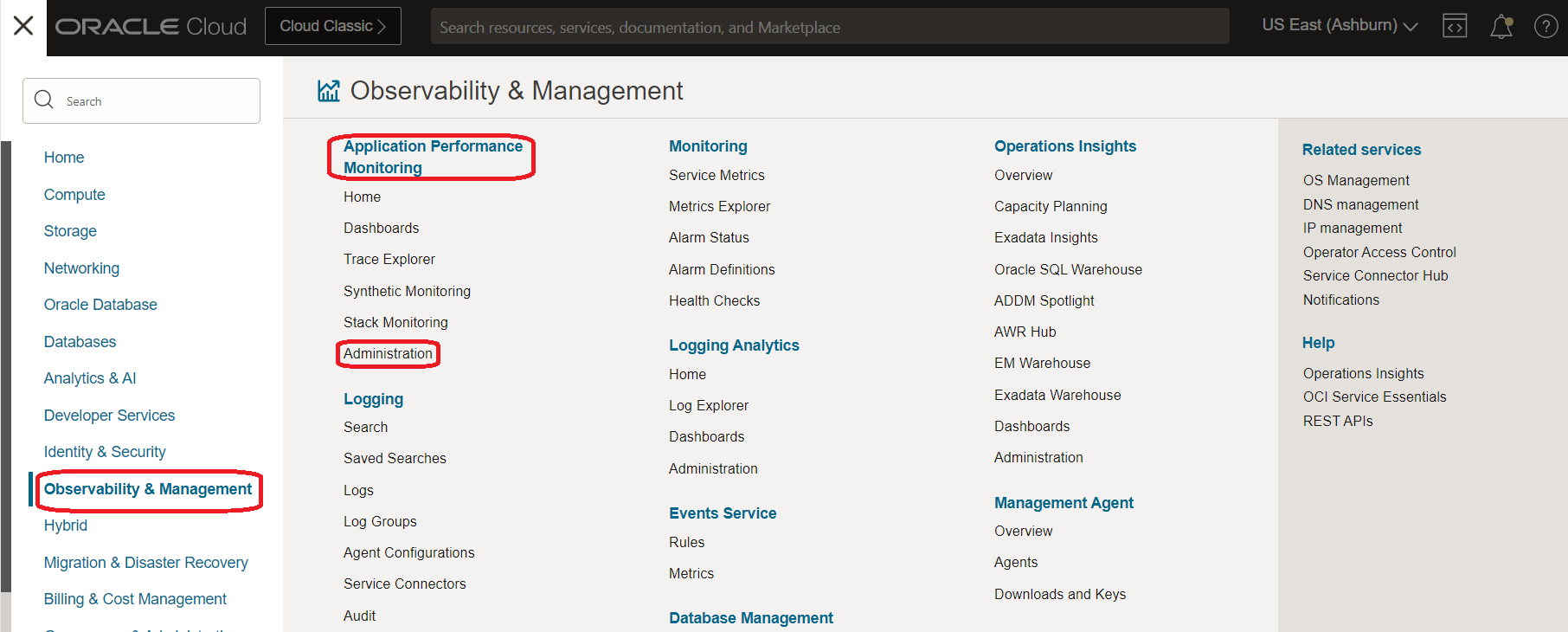 Faça login na console OCI e acesse Observability & Management -> Application Performance Monitoring -> Administration