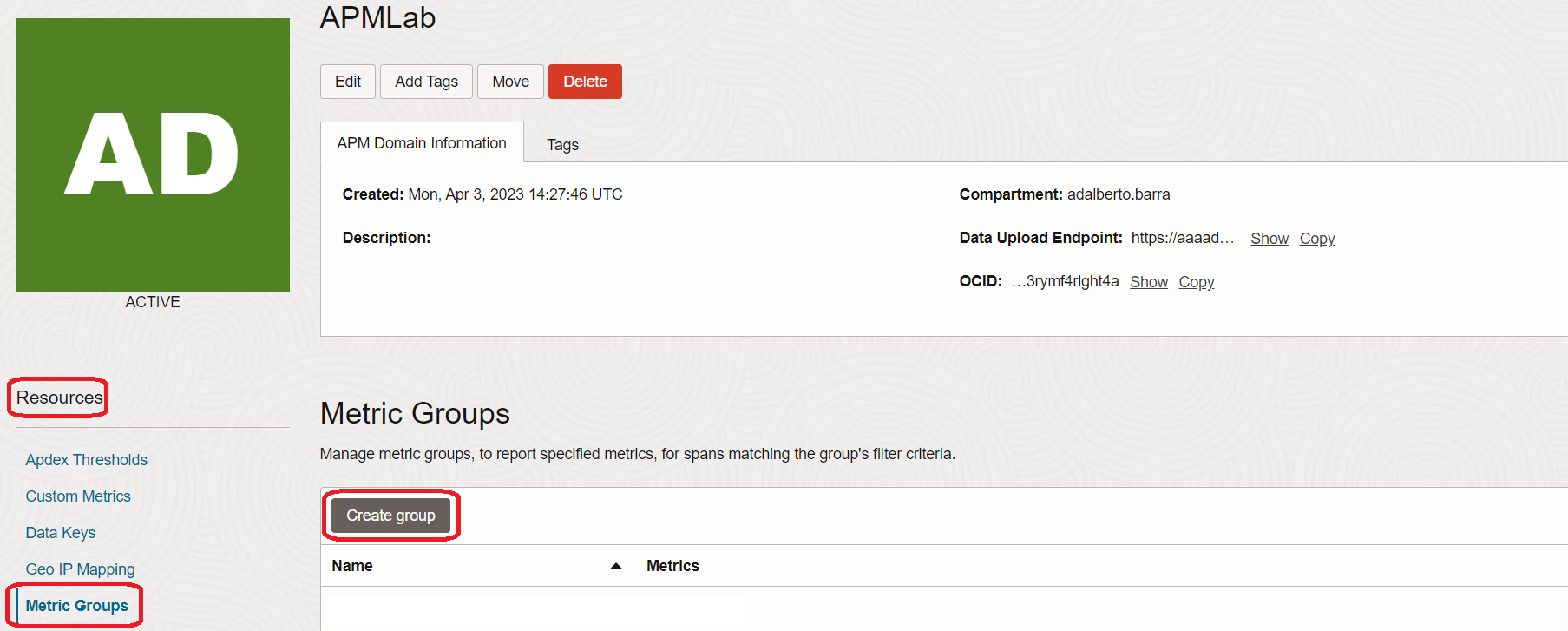Agora vamos criar o Metric Group. Em Resources, clique em Metric Groups e depois em Create Group