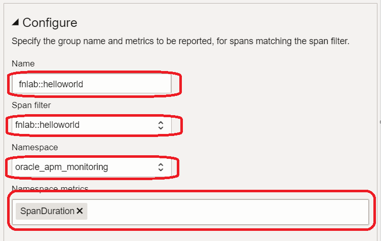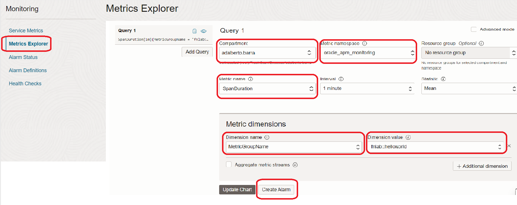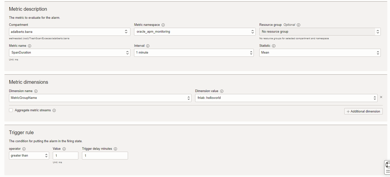 Preencha os campos de acordo com o Span Filter criado para a sua aplicação. Defina o Namespace oracle_apm_monitoring e a métrica SpanDuration