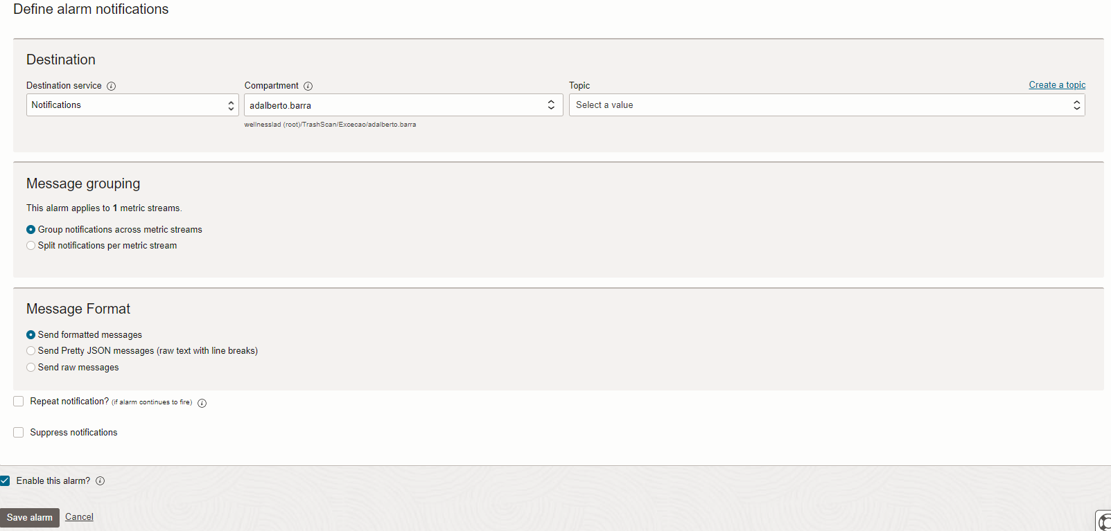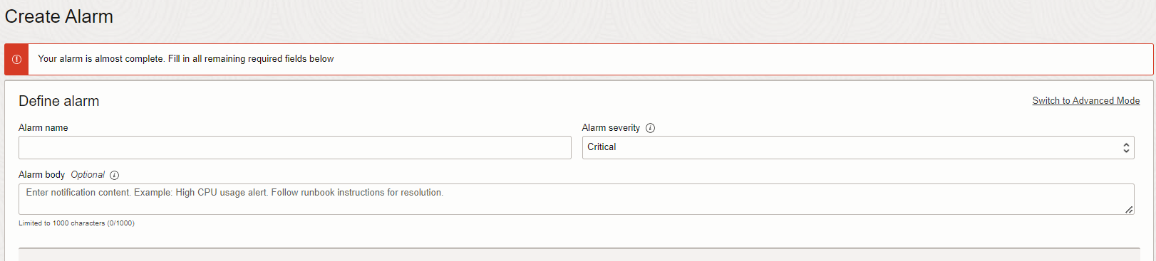 Preencha Alarm name, defina o Alarm severity e Alarm body