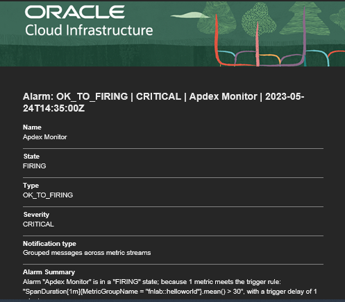 Após finalizar a criação do alarme, monitore no OCI APM os traces das chamadas na sua aplicação. Quando uma chamada registrar um tempo de resposta que excede o que você definiu na Trigger Rule do seu alarme, será enviada a notificação definida.
