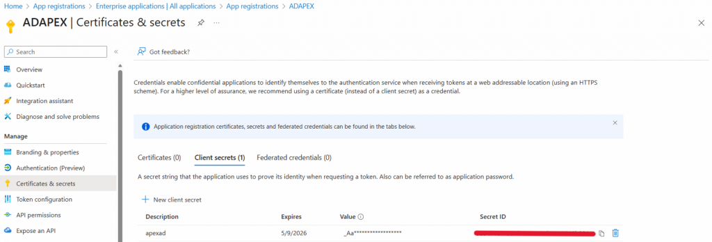 Após registro, anote o Client ID. Em sequência, crie um Client Secret em “Certificates and secrets” e salve-o em local seguro, ele será usado na configuração das credenciais no APEX. É recomendável salvar o valor do segredo em um local seguro temporariamente, pois o Azure exibe o segredo apenas por um período limitado.