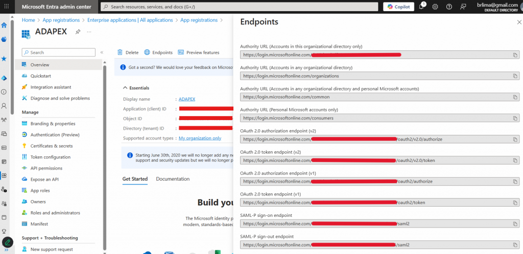 Ao clicar no botão “Endpoints”, serão exibidos todos os endereços de autenticação disponíveis para essa aplicação. Você precisará do ponto de autorização do Auth2 para fazer a chamada do login posteriormente, ao criar o esquema de autenticação no APEX.