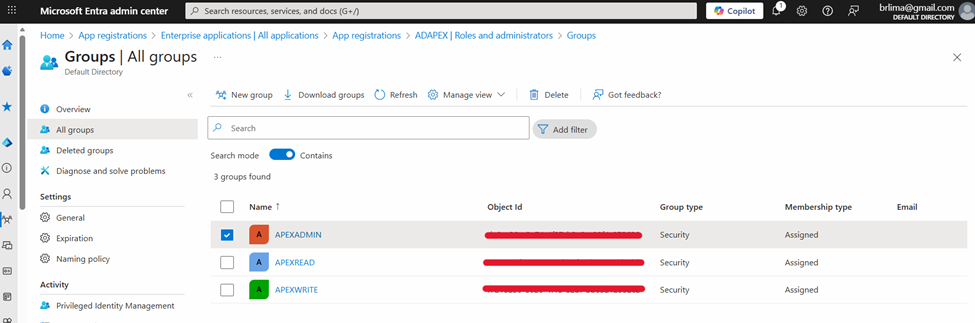 Se o objetivo fosse usar o Azure apenas para autenticação, as configurações anteriores já seriam suficientes. Todavia, para demonstrar como extrair informações do Active Directory para usuários no APEX, de forma que esses dados possam ser usados para controlar os níveis de autorização do usuário no aplicativo devemos acessar Entra ID > Groups. Aqui você pode criar os grupos de controle de acesso (ex: APEXADMIN, APEXREAD). Adicione os usuários desejados aos grupos conforme as regras de negócio da sua aplicação.