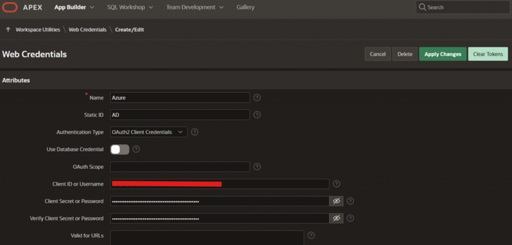 Em Workspace Utilities > Web Credentials, inclua o Client ID e Client Secret da aplicação Azure registrada. Com o tipo de autenticação sendo OAuth2.