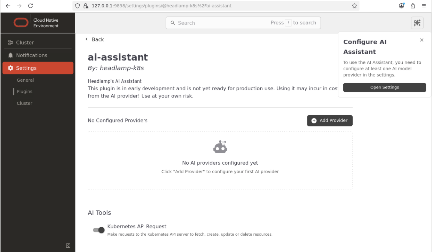 The AI Assistant in the latest Oracle Cloud Native Environment (OCNE) 2.3 release is a powerful tool designed to transform the way users manage and operate their Kubernetes workloads by leveraging modern artificial intelligence capabilities. By supporting integration with a wide range of leading AI providers and enabling seamless connections to preferred providers with a secure API key, the AI Assistant flexibly adapts to any organization’s requirements. For those needing enhanced privacy or control, it can also deploy using a local AI model through Ollama, ensuring sensitive data remains stored securely.