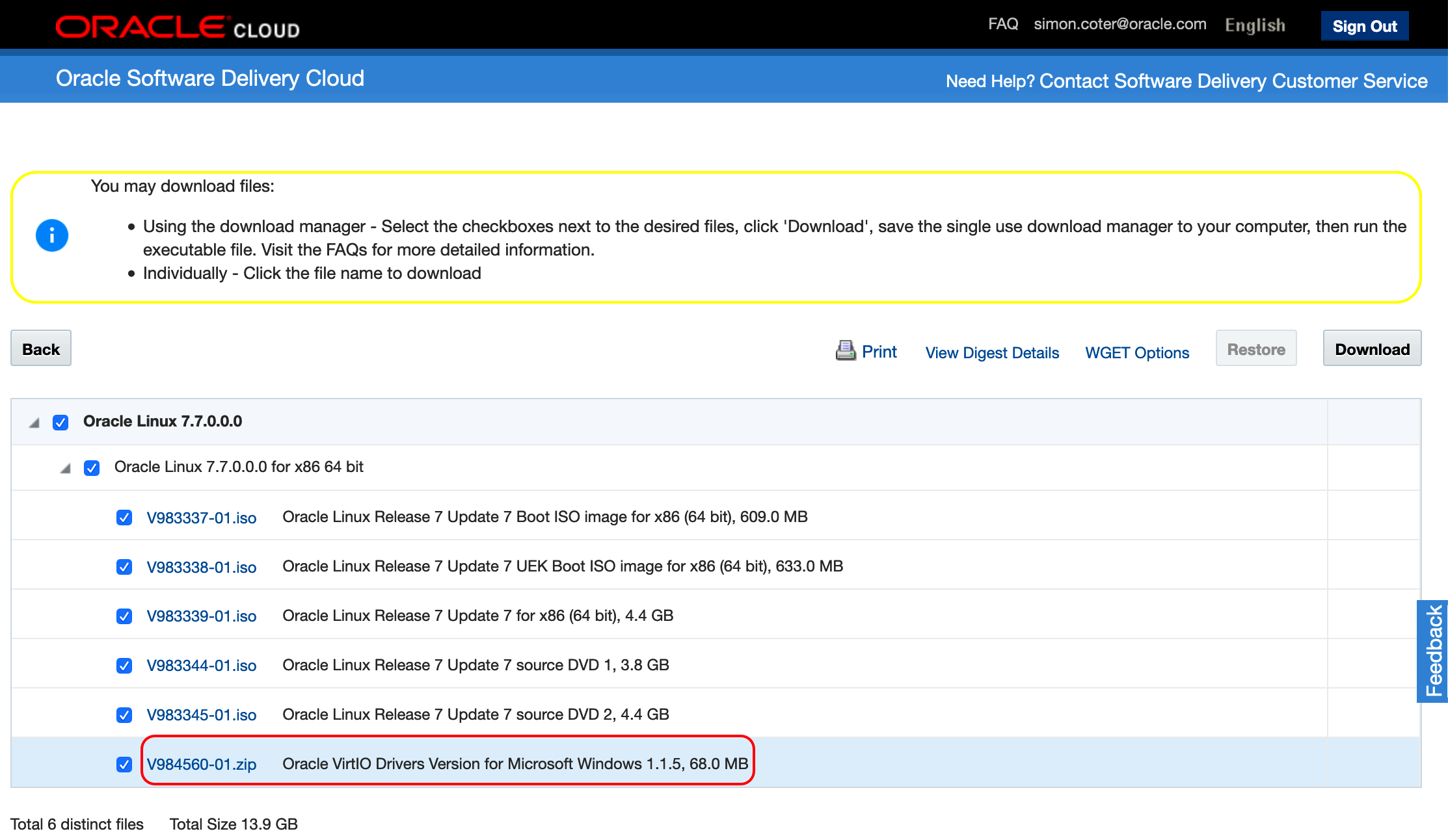 - Oracle VirtIO Drivers release 1.1.5 is available on the Oracle Software Delivery Cloud by searching on “Oracle Linux” and select “DLP:Oracle Linux 7.7.0.0.0 ( Oracle Linux )“