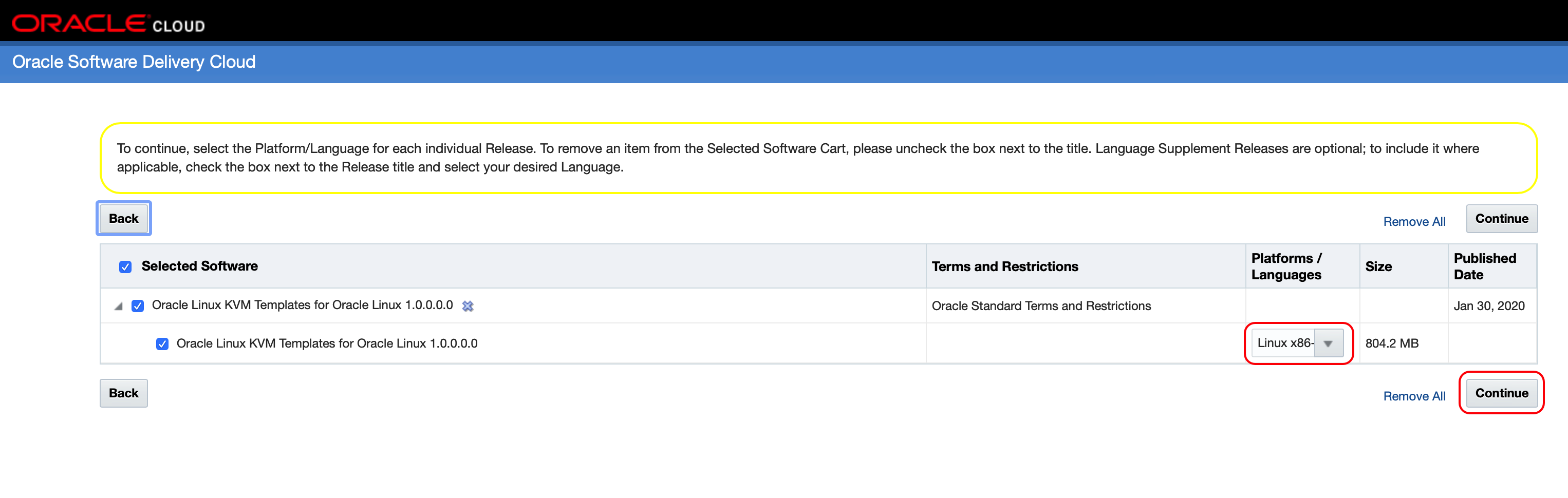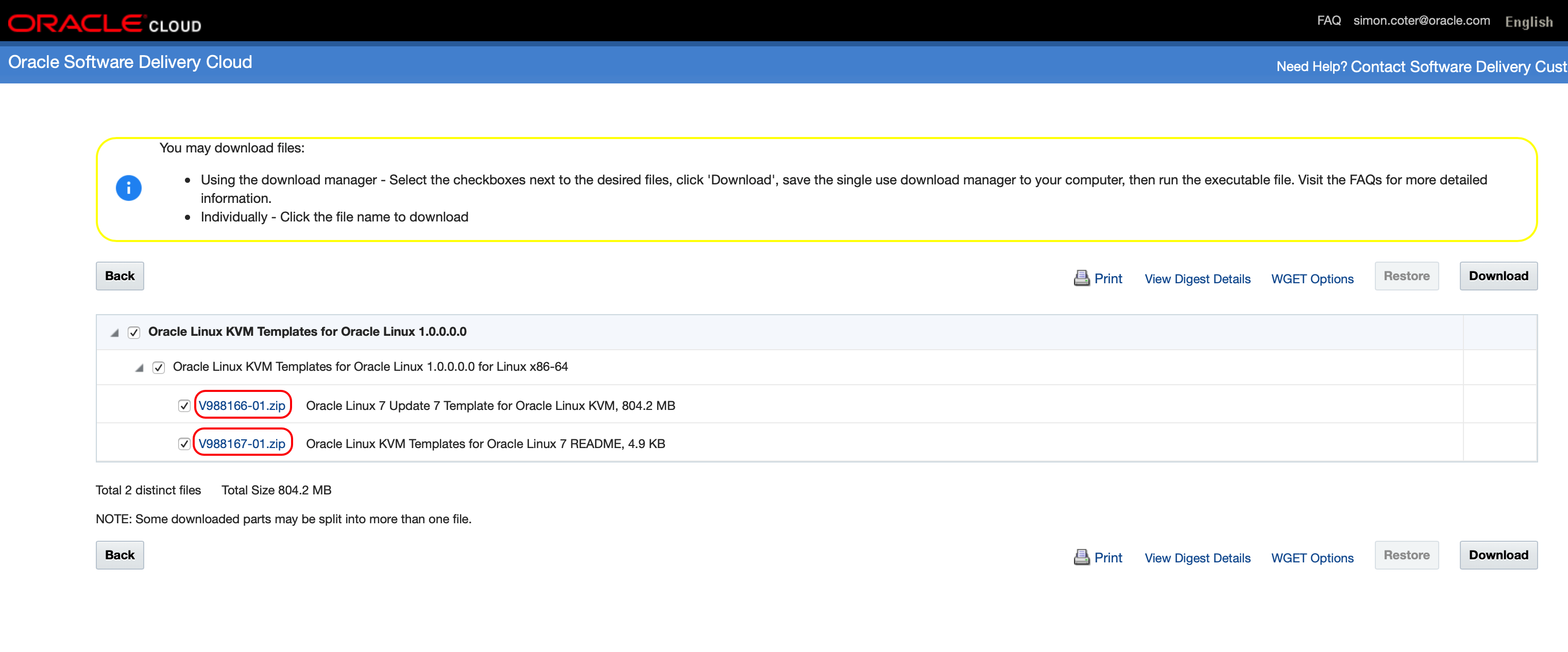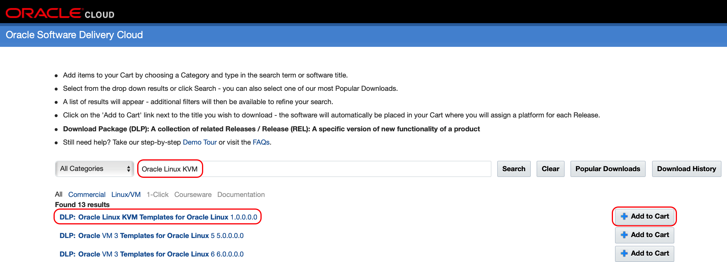 Oracle Linux 7 Template for Oracle Linux KVM is available on Oracle Software Delivery Cloud. Search for “Oracle Linux KVM” and select “Oracle Linux KVM Templates for Oracle Linux“