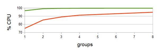 Elapsed time improves by 8 to 36%, costing at most 0.4% more find time. CPU busy utilization is close to 100% for the new kernel, as shown by the green curve in the following graph, versus the orange curve for the baseline kernel: