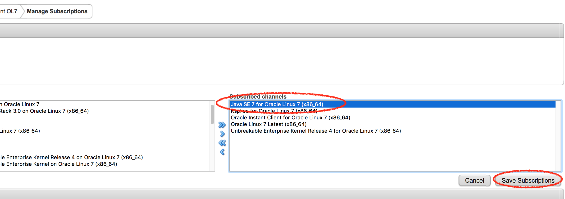 - Using the shuttle dialog, move the desired Java SE channel to the Subscribed Channels list, then click Save Subscriptions