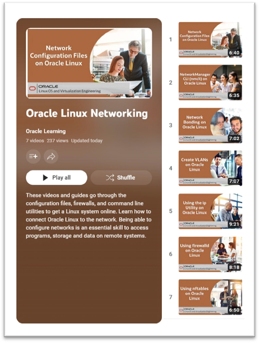 The Oracle Linux networking video playlist will guide your learning in these topics: