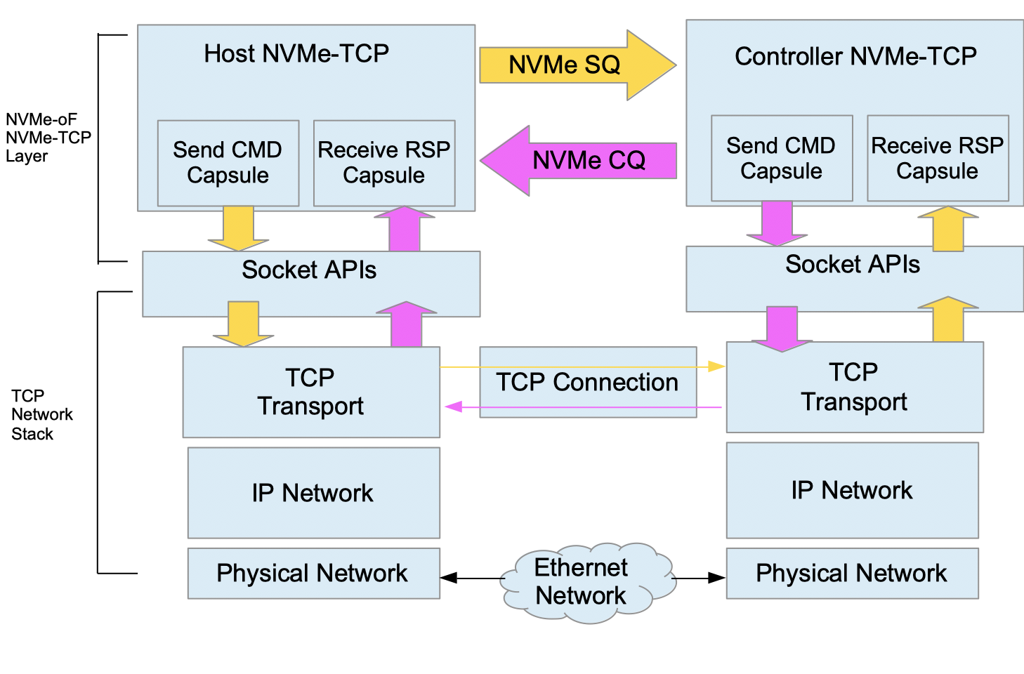NVMe over Fabrics extends this design so submission and completion queues in host memory are duplicated in the remote controller so a host-based queue-pair is mapped to a controller-based queue-pair. NVMe over Fabrics defines Command and Response Capsules that are used by queues to communicate across the fabric as well as Data Capsules. NVMe-TCP defines how these capsules are encapsulated within a TCP PDU (Protocol Data Unit). Each host-based queue-pair and its associated controller-based queue-pair maps to its own TCP connection and can be assigned to a separate CPU core.