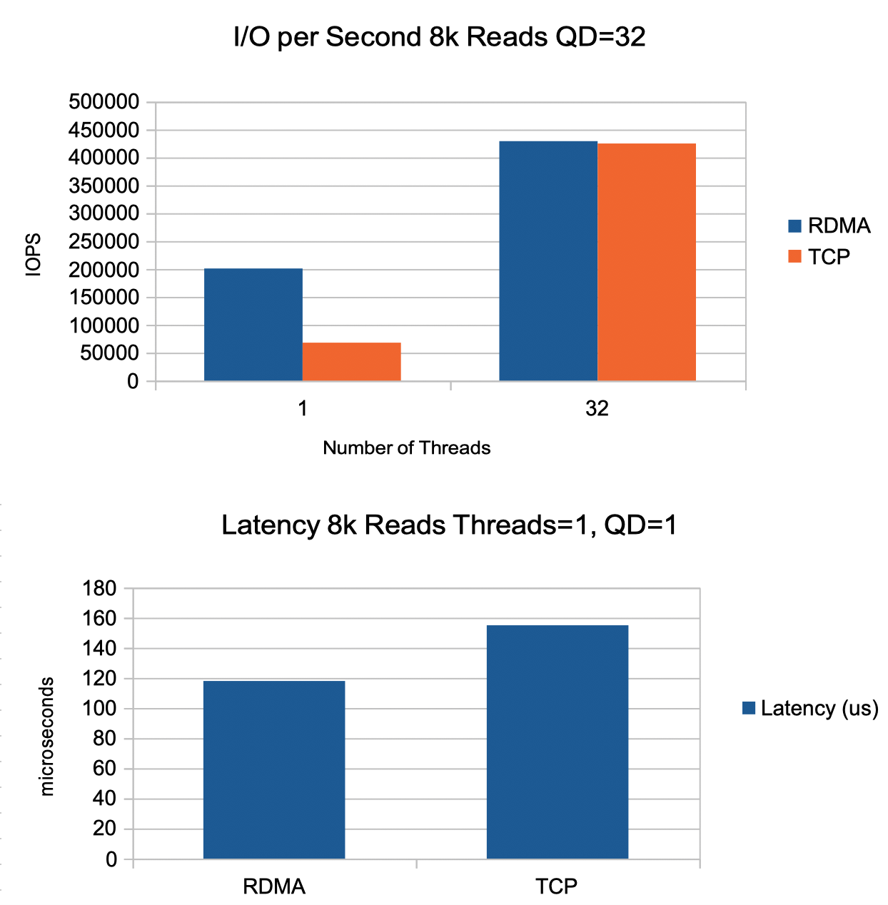 Latency was measured using a 8k read from a single thread with a queue depth of 1. TCP latency was 30% higher than RDMA. Much of the difference is due to the buffer copies required by TCP.