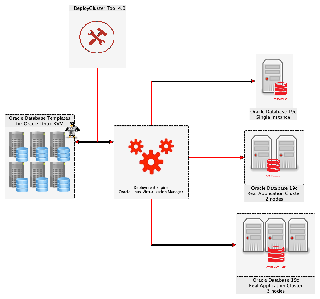 Oracle Database Templates for Oracle Linux KVM provide a framework that automates the creation of a single instance, Oracle Restart (single Instance/HA), or an Oracle Real Application Clusters (RAC) configuration in an Oracle Linux KVM environment. In a matter of minutes, the versatile and powerful Oracle Database Templates can be cloned into any number of VMs and deployed as a single Instance, Oracle Restart (single Instance/HA), or Oracle Real Application Cluster.