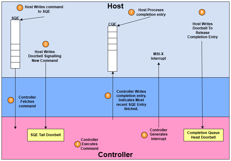 - Finally, the host updates the Completion Queue Head Doorbell register to signal that the completion queue entry has been processed. Multiple entries can be processed before updating this register.