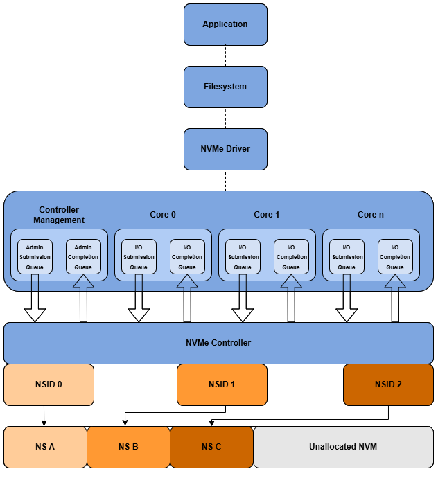 In Linux, each namespace is exposed as a block device (e.g., /dev/nvme0n1), where nvme0 refers to the controller and n1 denotes the namespace.
